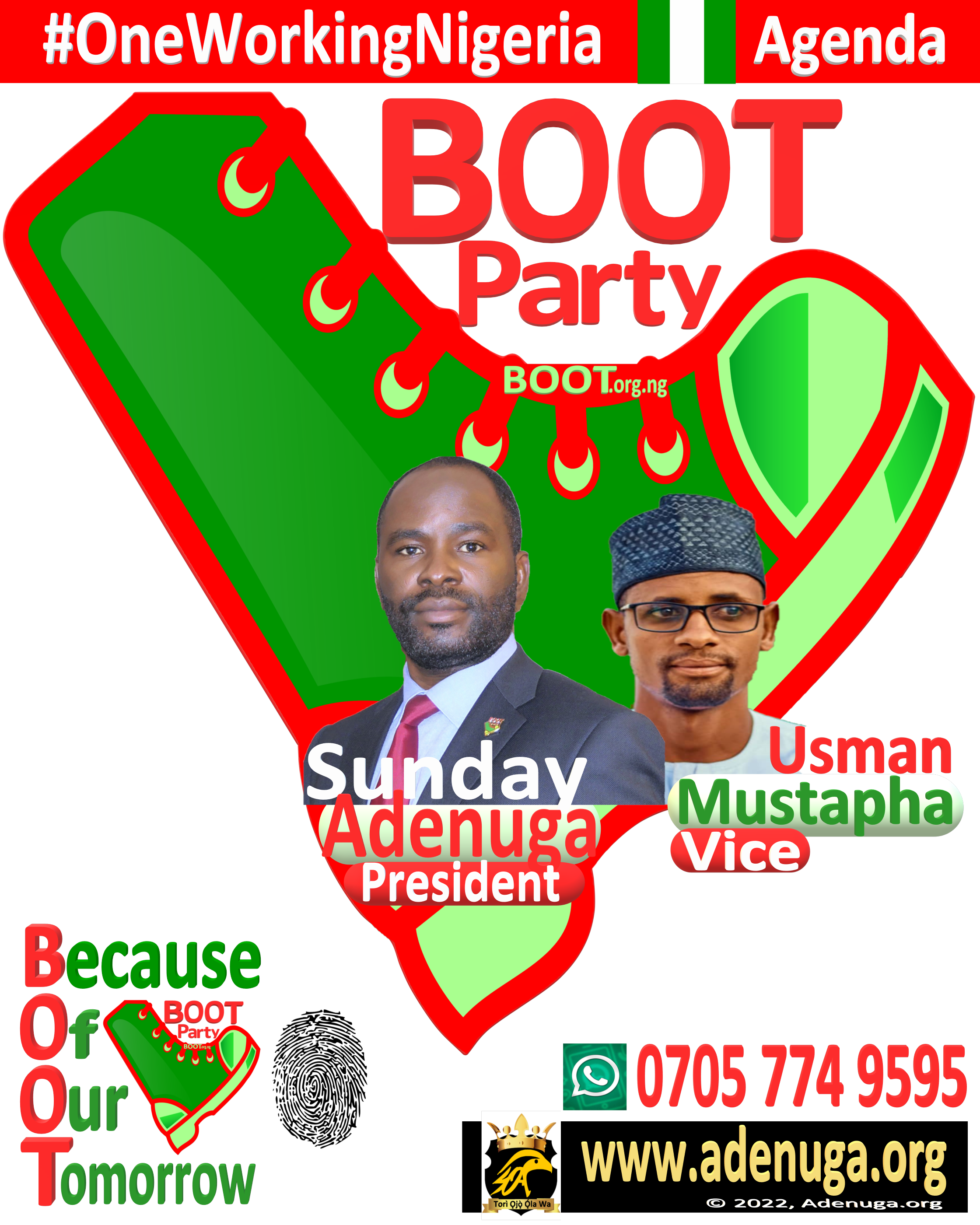 Globally and indeed many Nigerians have talked about the potential of our country without seeing it happening. The yearning of many and especially the younger generation is to see a One Working Nigeria. Through the BOOT Party's One Working Nigeria (OWN) Agenda, we shall be restructuring Nigeria to work for every Nigerians including Governance; Economy and Human Capital Development. One Working Nigeria is a must.